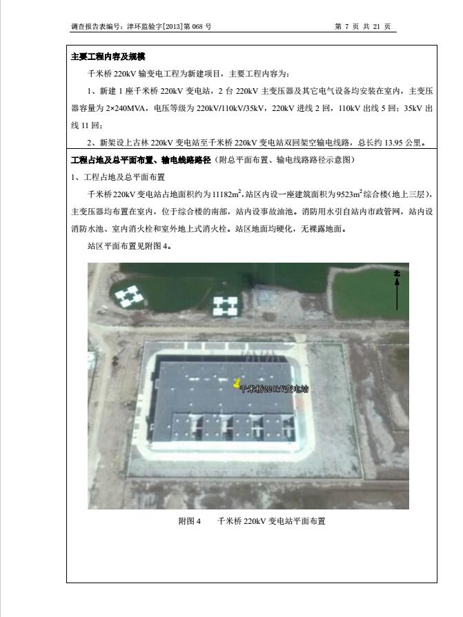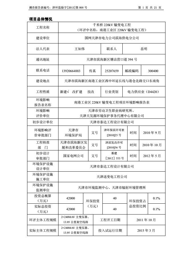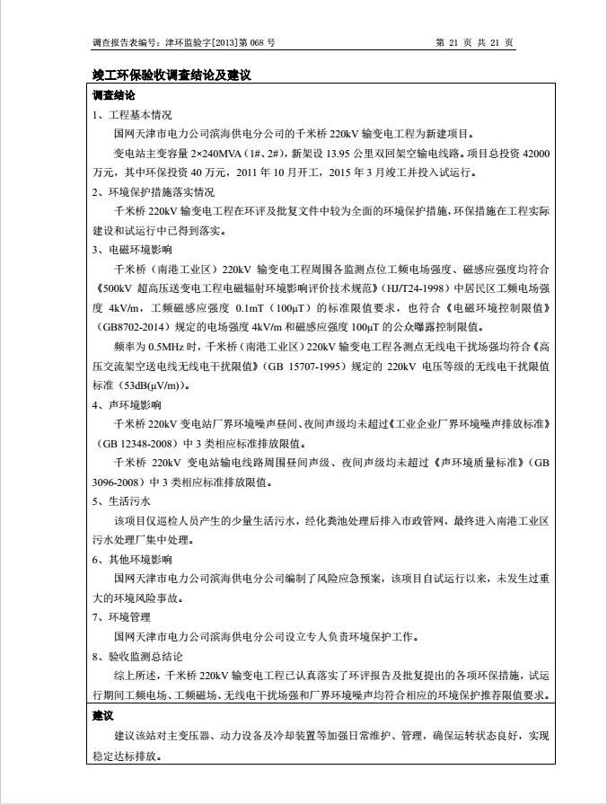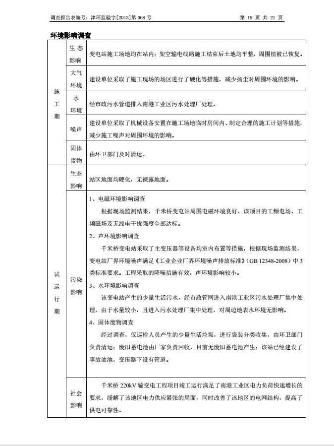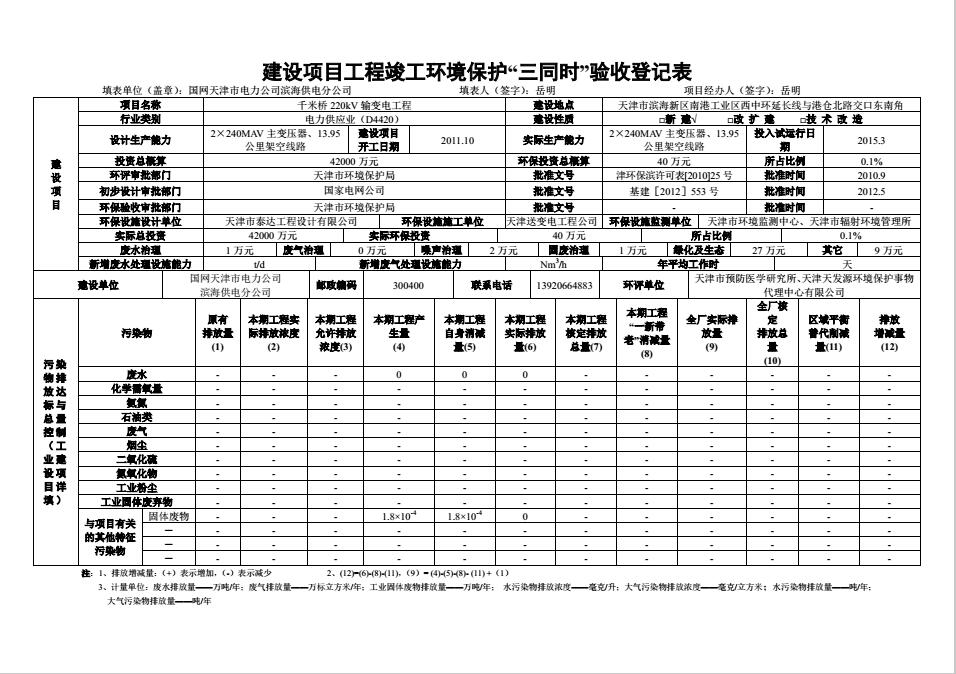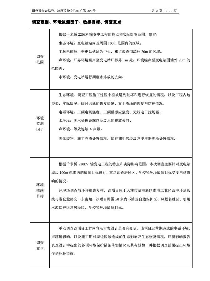 千米橋220kV輸變電工程驗(yàn)收調(diào)查表