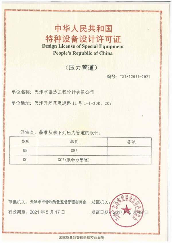 5月18日,天津市泰達工程設計有限公司通過天津市市場和質(zhì)量監(jiān)督管理委員會審批,取得“中華人民共和國特種設備設計許可證(壓力管道)”,獲準從事GB2、GC2級壓力管道設計工作。該項資質(zhì)的獲得,進一步增強了泰達設計在熱力工程設計方面的市場競爭力。
